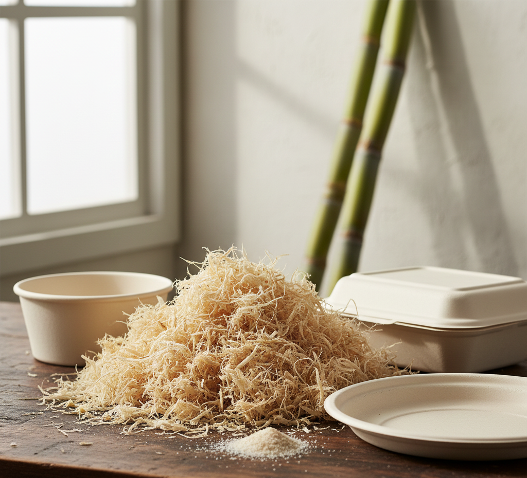The material resulting from sugar cane for food packaging is bagasse, which is obtained after extracting the juice from the stalks. This plant residue is light, moldable, and resistant to heat and moisture. Unlike petroleum-derived plastics, bagasse is compostable, meaning it can degrade under controlled conditions in a short period.